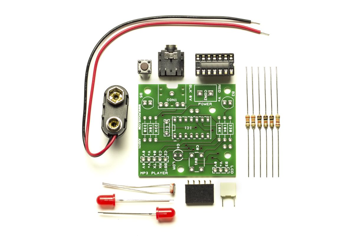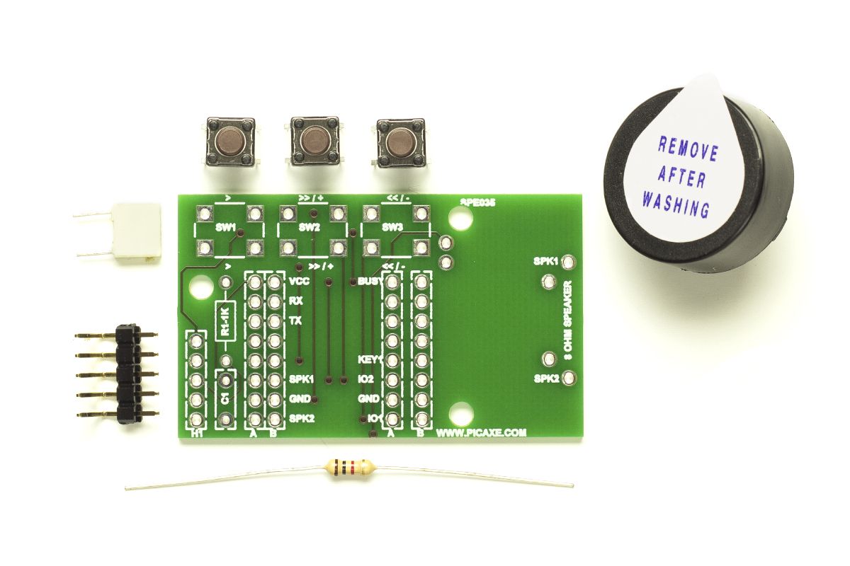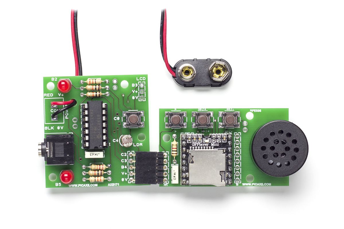 The optional PICAXE-14M2 board is a self assembly project kit that links directly to the MP3 board and enables the playback of multiple music/speech and MIDI MP3 files via a PICAXE-14M2 chip, so is ideal for rapid prototyping.