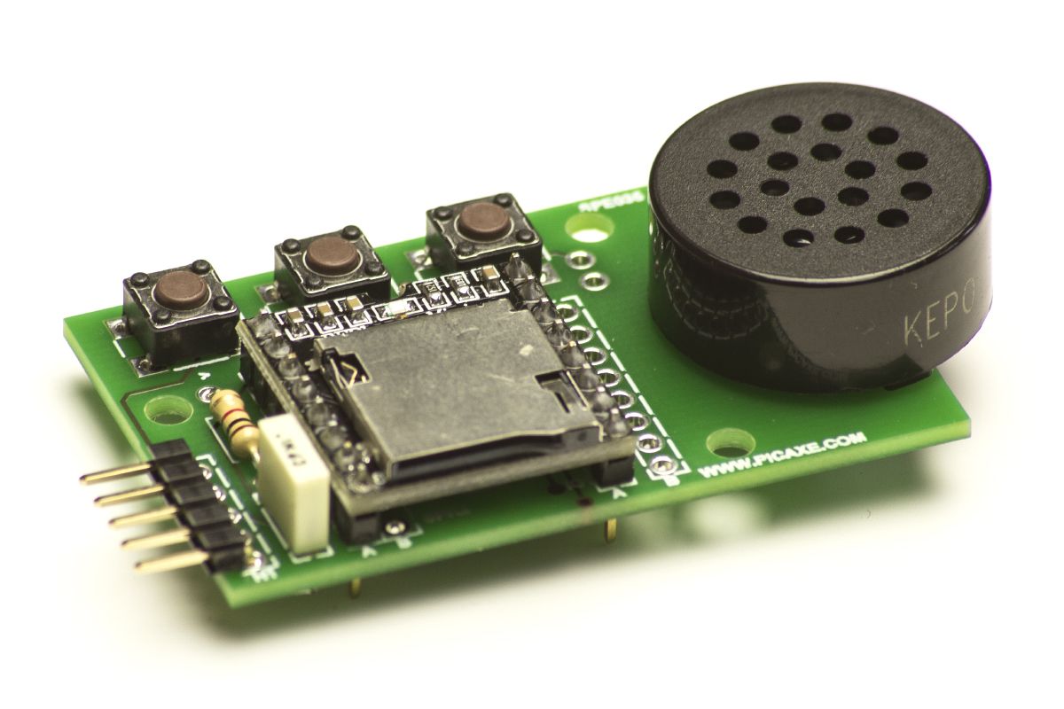 By connecting 3 wires to the project board (signal, power, ground) you can then play any track (and adjust the sound volume) by using simple serial commands. If desired an additional 'BUSY' feedback signal may also be fed back to the PICAXE chip (so that you can detect when the tune has stopped). Playback may also be controlled manually via the 3 switches on the project board - play, next track/volume+, previous track/volume-