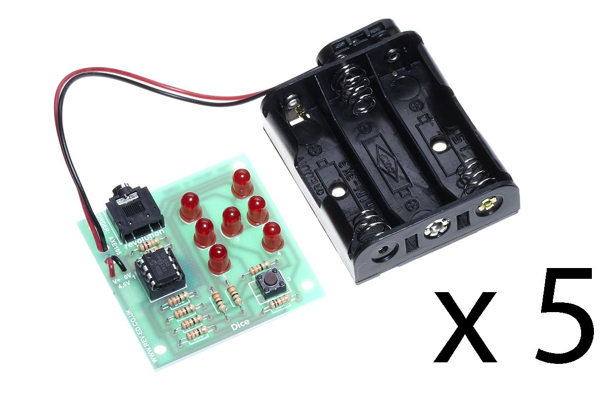 The PICAXE Dice project uses an 8-pin PICAXE microcontroller to create an electronic dice with seven LEDs arranged in a familiar dice pattern controlled by the PICAXE to show the number rolled.