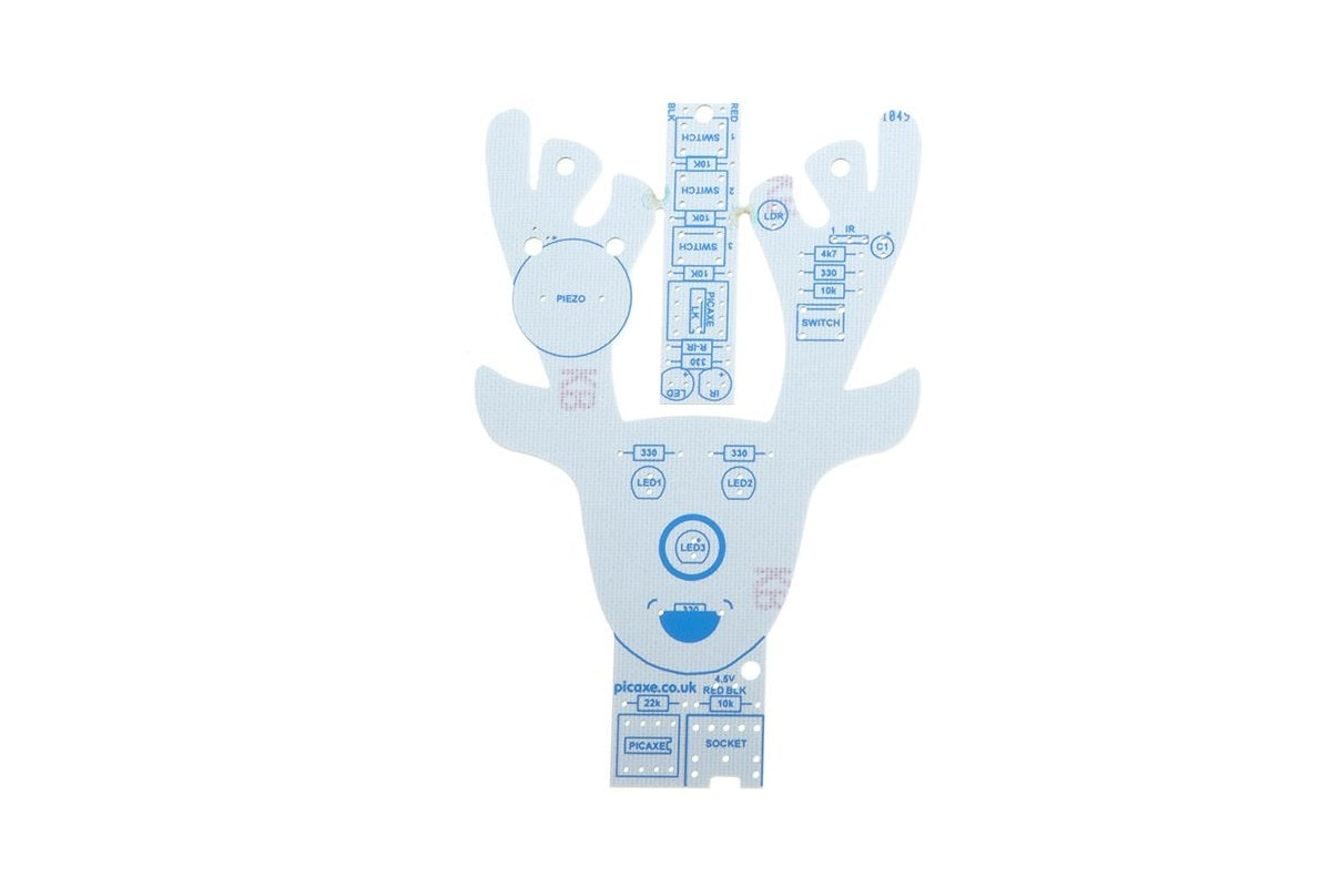 The full kit Includes PCB and all electronic components for the main Rudolph PCB, including a PICAXE-08M2 chip and sounder. Requires simple soldering.