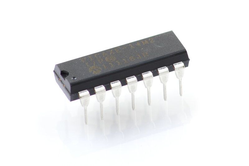 PICAXE-14M2 microcontroller chip. Supports 12 inputs/outputs, with enhanced features such as parallel tasks, ring tone music and touch sensor inputs