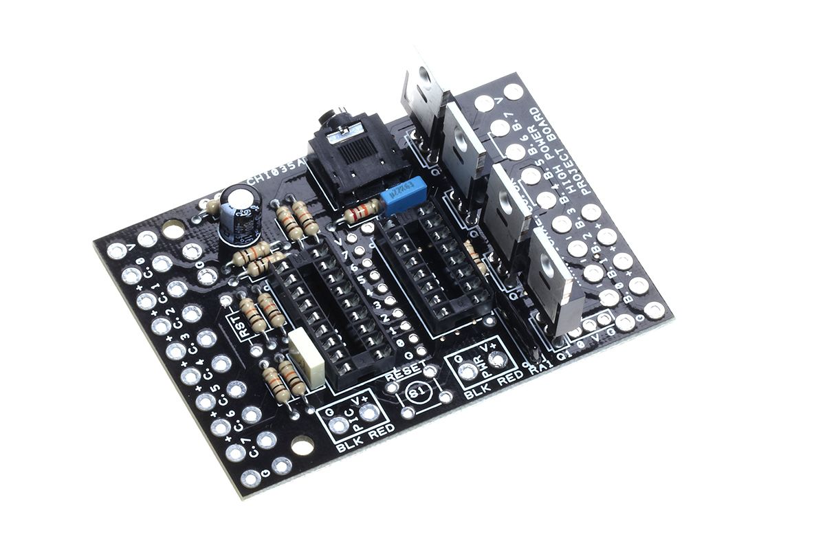 Addition of L293D chip (not supplied) provides two reversible motor outputs.