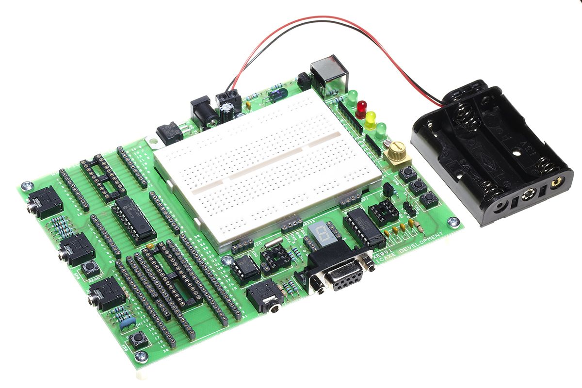 The board can be powered via batteries (battery box included), or an external power supply (sold separately), and the board has onboard regulated power supply, with LED power indicator.